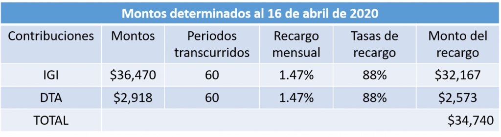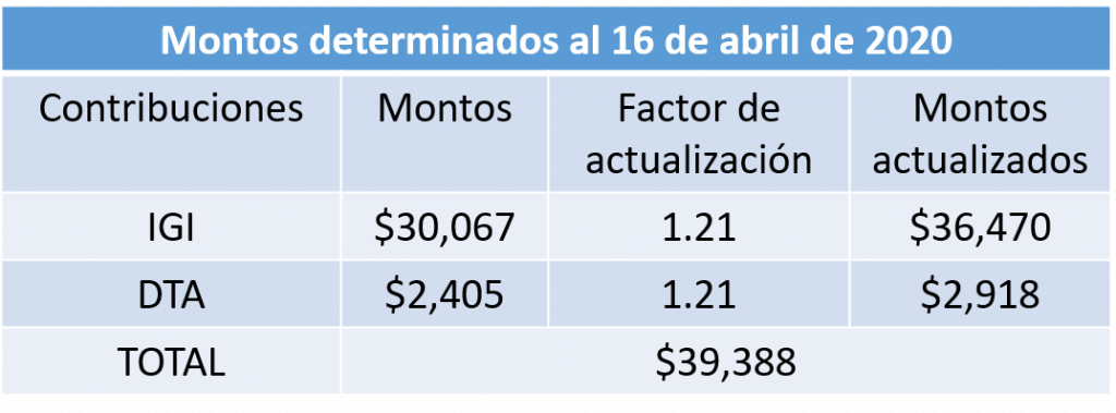 En este caso, el contribuyente determinó las contribuciones al momento de su introducción al país, mismas que ascendían a 32 mil 472 pesos; sin embargo, al no cumplir con su compromiso de retorno del contenedor al extranjero, la autoridad le exigió el pago de los montos actualizados al momento en que se detecta la infracción, teniendo un incremento por concepto de actualización de 6 mil 915 pesos, resultando un monto a pagar actualizado para las contribuciones por 39 mil 388 pesos.