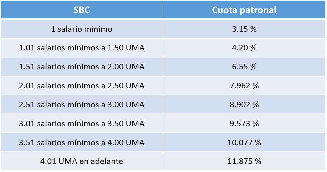 - De 2024 a 2029, la cuota patronal será desde 3.150 % sobre trabajadores que ganen un salario mínimo y un máximo de 5.331 %; 6.422 %; 7.513 %; 8.603 %; 9.694 % y 10.784 % por cada año subsecuente sobre trabajadores cuyo SBC sea de 4.01 UMA en adelante.