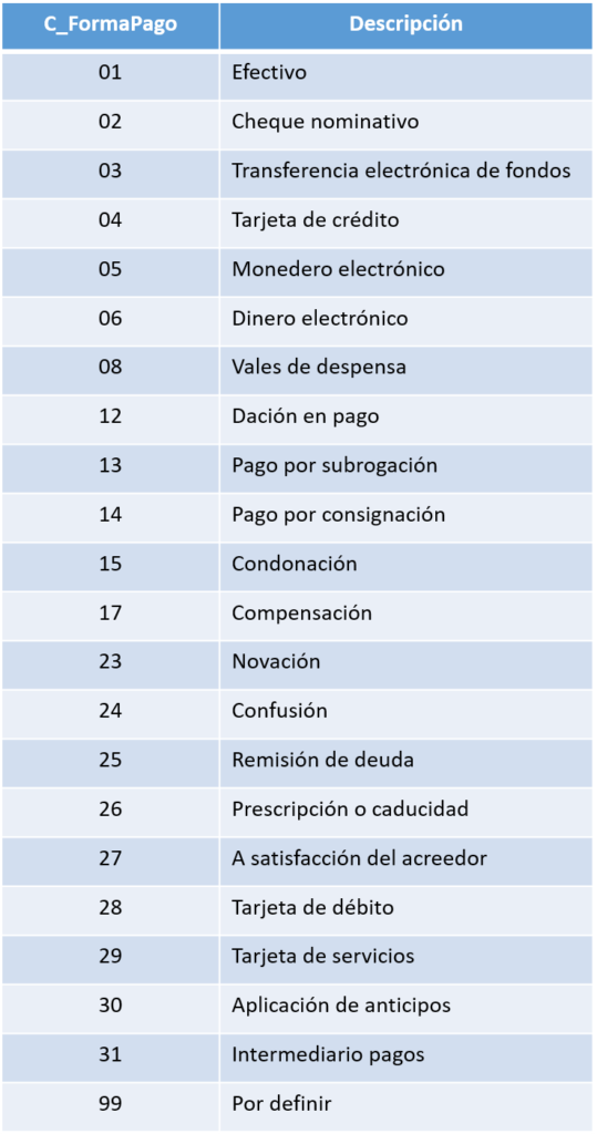 De acuerdo con la Guía, en el nodo “Forma pago” se registra la clave de la forma de pago de los bienes, prestación de los servicios, el otorgamiento del uso o goce o la forma en que se recibe el donativo, contenidos en el comprobante.