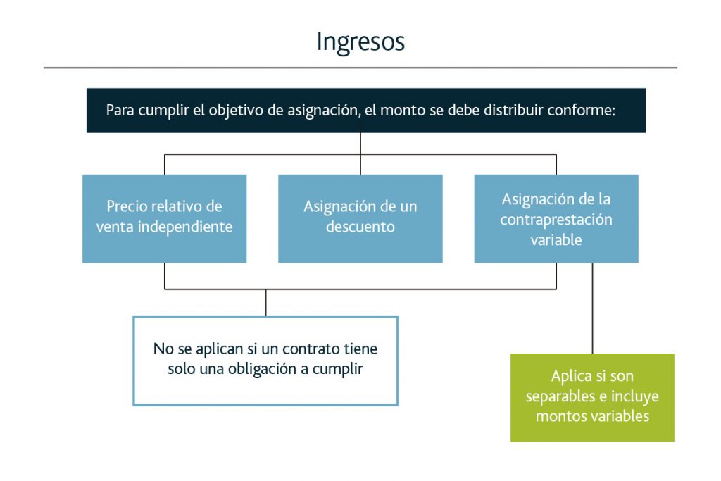 La Norma de Información Financiera NIF D-1 señala que: “la entidad debe asignar el monto de la transacción a cada obligación a cumplir (a cada bien o servicio que sea separable), por un monto que represente la parte de la contraprestación a la cual la entidad considera tener derecho a cambio de transferir el control sobre cada uno de los bienes o servicios acordados con el cliente.”