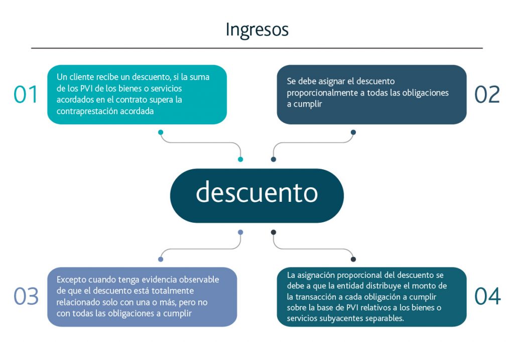 Una consecuencia de asignar el precio de la transacción sobre la base del precio de venta independiente relativo, es que cualquier descuento en el contrato se asigna proporcionalmente a cada una de las obligaciones de desempeño del contrato.