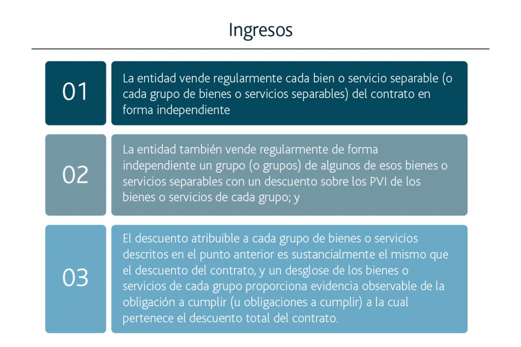 Una entidad debe asignar un descuento en su totalidad a una o más, pero no a todas, las obligaciones a cumplir, si se cumplen todos los criterios siguientes: