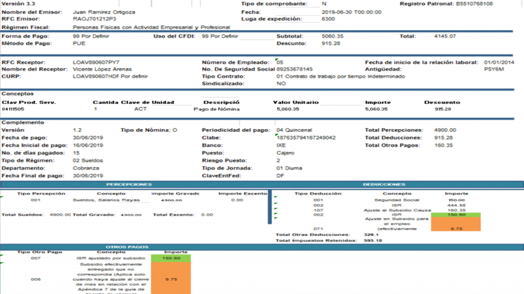 - La cantidad de $150.60 pesos corresponde al ISR causado por el trabajador en la primera quincena del mes de junio y que se dejó de retener al trabajador, cantidad que se debe registrar como una deducción con la clave “002” (ISR) y como un pago en el nodo “Otros Pagos” con la clave “007” (ISR ajustado por subsidio). Lo anterior tiene por objeto, recuperar el ISR correspondiente a la primera quincena del mes de junio, mismo que el empleador deberá enterar al SAT.