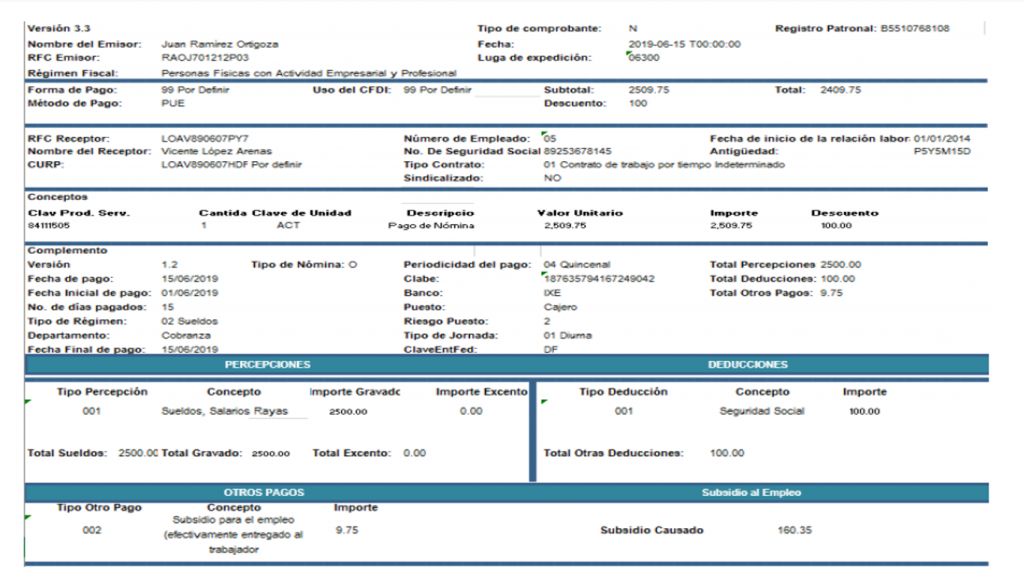En la primer quincena del mes de junio de 2019, un trabajador percibe un salario de $2500.00 pesos, por lo tanto, conforme a la Tabla del subsidio para el empleo del Anexo 8 de la Resolución Miscelánea Fiscal vigente, a dicho trabajador le corresponde un subsidio para el empleo de $160.35 pesos 00/MN, en ese sentido, el trabajador tiene derecho a que el empleador le entregue la diferencia que resulte del ISR a cargo y el subsidio para el empleo aplicado, y que en el caso en concreto dicha diferencia corresponde a $9.75 pesos. Lo anterior, se refleja en la siguiente imagen y representación gráfica del CFDI.